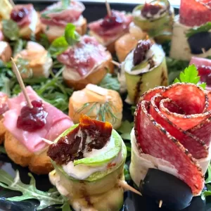 Mini frigarui cu bocconcini, salam, sos pesto