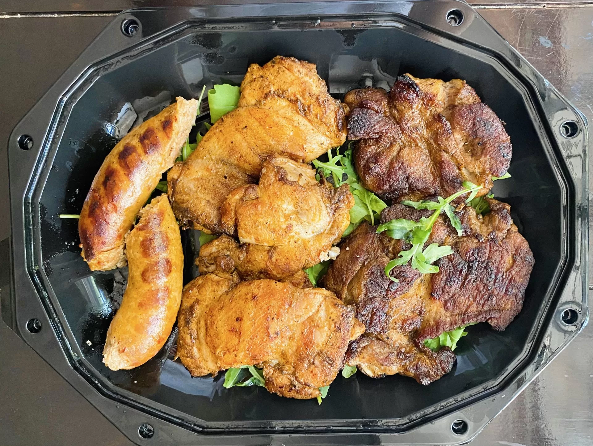 Acest platou delicios conține carne de pui și de porc la grătar, alături de legume la grătar sau cartofi wedges pentru garnitură.