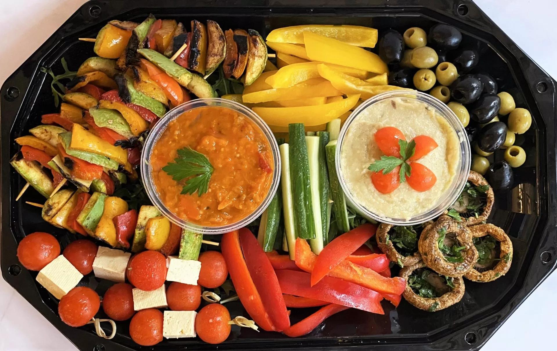 – Halloumi Burgeri: branza Halloumi, Rucola, rosii, ceapa rosie, castraveti, maioneza vegetariana.4-5 persoane (6 mini-burgeri, cartofi prajiţi)